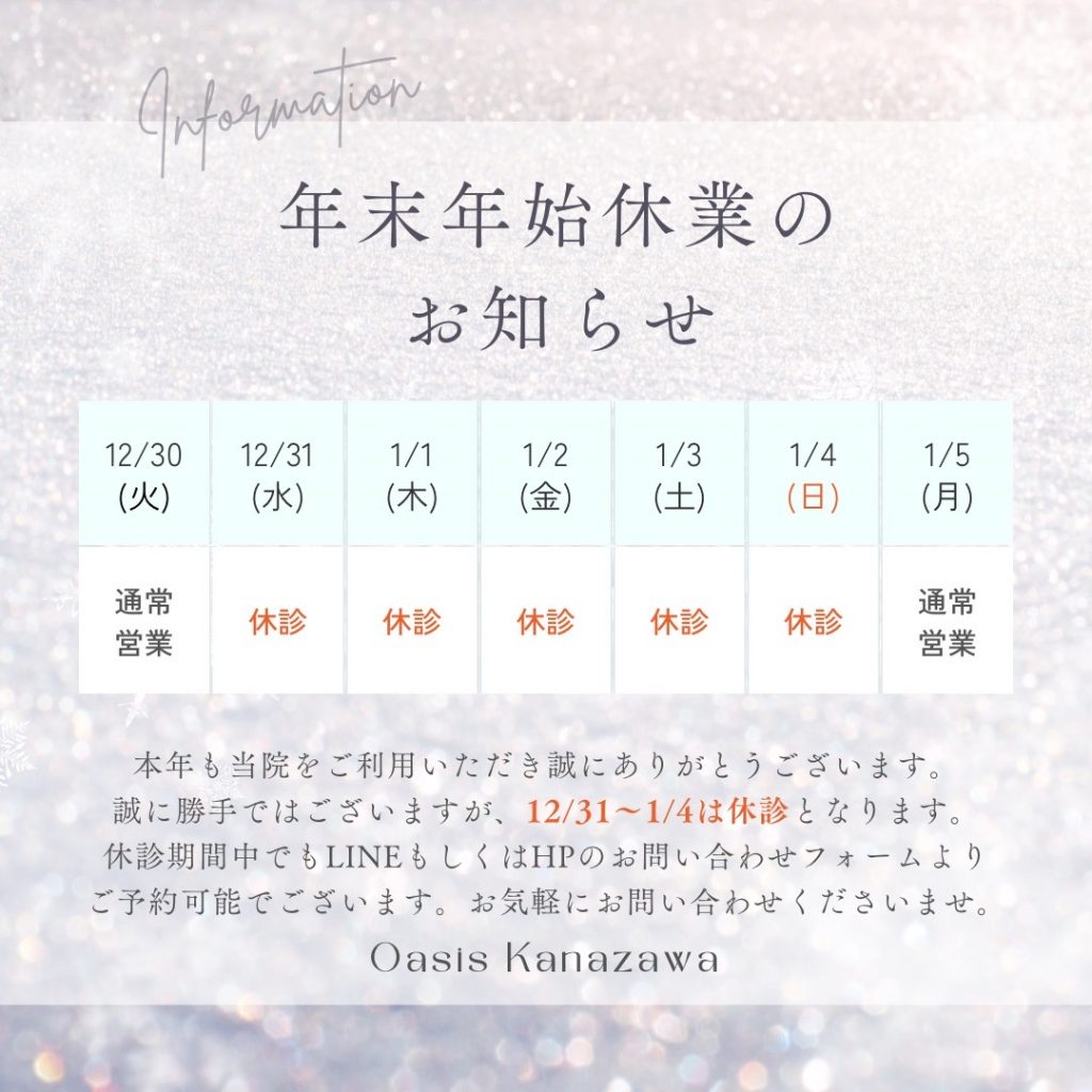 誠に勝手ながら、12/31(水)~1/4(日)は休診 とさせていただきます。