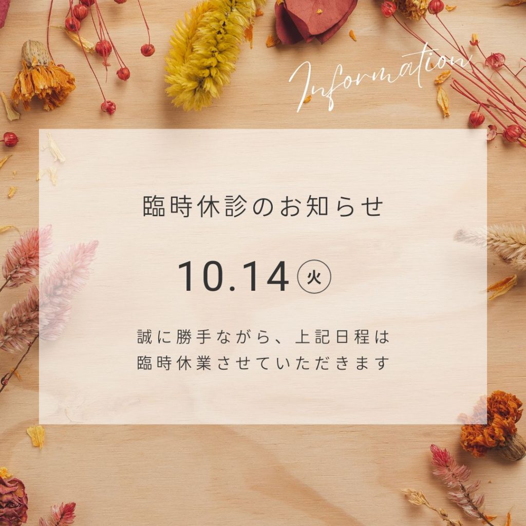 誠に勝手ながら、10/14(火)は臨時休診 とさせていただきます。